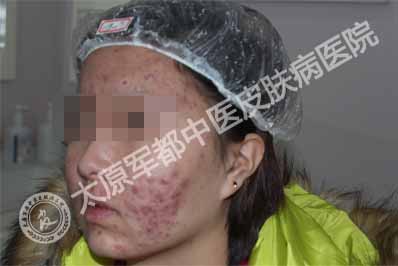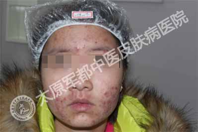 太原肤康皮肤病医院首席祛痘医生接诊了该患者,诊断为粉刺脓疱型痤疮。因脸上这样的惨状,她很不自信,经常把自己关在房间里,同学聚会也不参加……从这个女生的诉说中,主任还得知了她此前在别处求医后治疗无效的无奈。