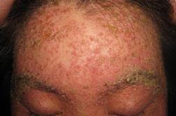 脂溢性皮炎以皮肤油脂分泌旺盛为诱因,伴有田拉色素真菌,产生皮肤炎症。一般多发于面部、头皮(伴发脱发)、眼睑、前胸、腋窝等部位,表面附着油腻性鳞屑,皮损呈现暗黄红色斑或丘疹,瘙痒难忍。