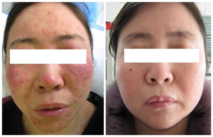 治疗过程:于2015年2月到肤康皮炎专科就诊,接诊医生采用中西医清脂灭菌固表三联疗法为她进行中药调理、面部雾化熏蒸3次和复合光治疗2次。经治疗8天后治好。2015年5月来院复查无反复。