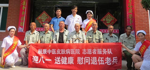 太原肤康中医皮肤病医院志愿者服务队是由医院医护人员自发组建的致的公益组织。本着“奉献、友爱、互助、进步”的志愿者精神,医护志愿者在为老兵们送上慰问品的同时为他们仔细进行健康检查和生活护理,用微笑和爱心让老兵们感受到浓浓的亲情和社会大家庭的温暖。