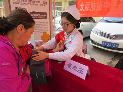 当天早上8点30分左右,记者来到现场看到,已有居民早早过来等候看诊。在义诊检查中,太原肤康医院的医务人员为每一个前来参加义诊的居民进行了认真的检查,并耐心细致地为居民分析、讲解。本次社区义诊活动服务内容包括免费为社区居民进行血压测量,分发大量健康传单,对居民进行广泛的皮肤健康知识宣传和简单的健康咨询。
