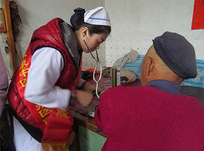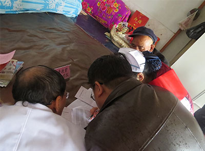 有的村民白天不在家,肤康医疗队只能夜间探访,由于贫困,村民家房顶有些漏水,导致电灯电路损坏,志愿者用手电筒照明,为村民进行健康筛查。